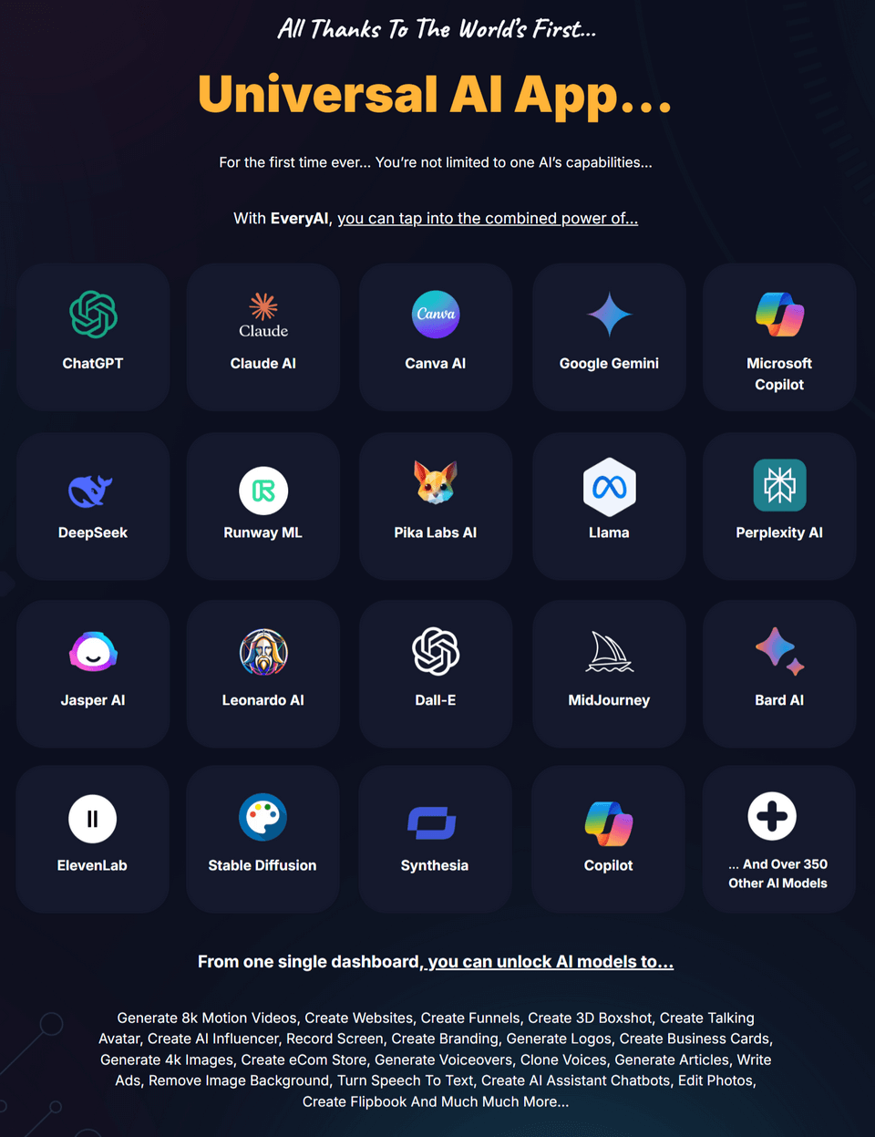 What You Get: Full access to the EveryAI dashboard with 350+ integrated tools (ChatGPT, MidJourney, Claude, Runway, ElevenLabs, Canva AI & more).