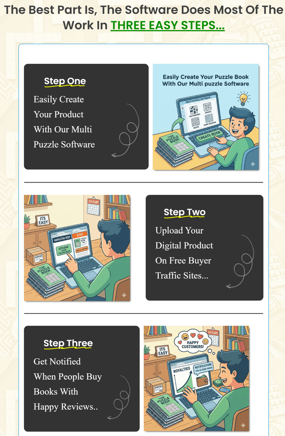Instead of manually designing puzzle pages or struggling with formatting, the software promises a simple point-and-click system that can create complete puzzle book interiors in minutes. According to the developers, the goal is to help beginners publish more books quickly and build a long-term catalog of puzzle products that can generate royalties over time.