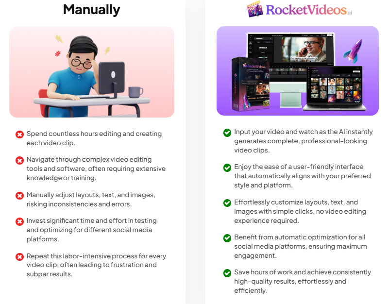 Compared with hiring editors or paying monthly software subscriptions, RocketVideos AI provides an affordable way to produce professional videos.