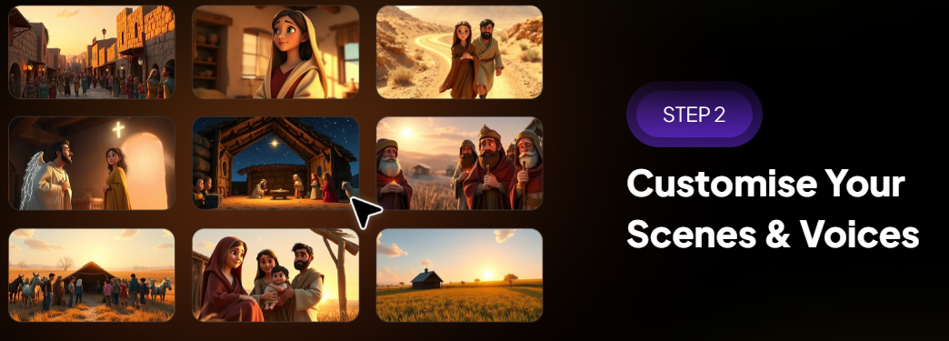 The AI selects appropriate visual scenes, characters, animations, and transitions to match the story.