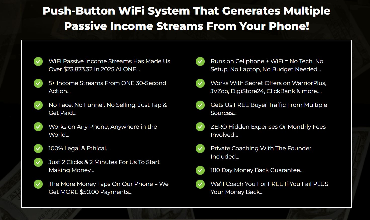Overall, WiFi Passive Income Streams positions itself as a simplified online business model focused on automation, affiliate marketing, and multiple digital revenue streams that can be managed from anywhere with a WiFi connection.